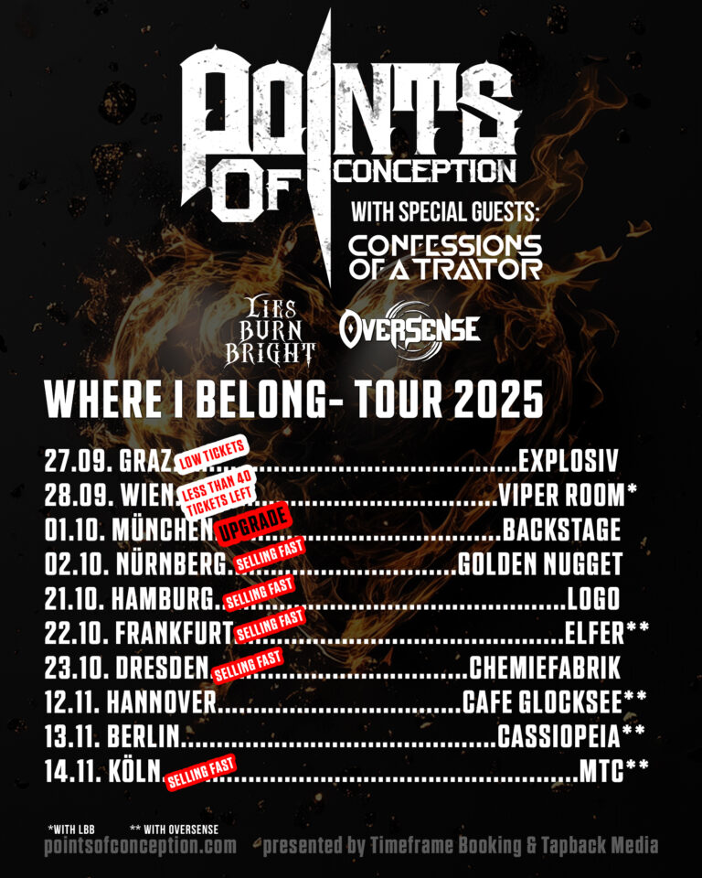 Points Of Conception is an alternative, post-hardcore inspired metal band from Vienna, Austria delivering high energy vocals, catchy hooks, heavy riffs, familiar core vibes with a fresh new unique sound of their own. Since their debut in 2019, their music was listented to over 11.000.000 streams as an independent band. They shared the stage with big names such as Dead by April, Self Deception, and Awake the Dreamer. Stay tuned!
